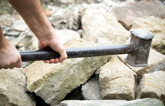 athlete and hammer. guy with a nice muscle fitness, bodybuilder hold big metal hammer