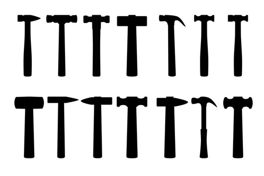 A set of hammers. Sledgehammer, mallet, small hammer, big hammer. Silhouette of the hammers.