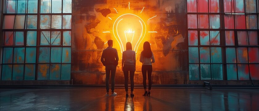 Group of people brainstorming together. Brainstorming concept with lightbulb. Photo of big lightbulb