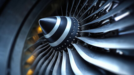 Close up view of an airplane turbine, jet engine rotating