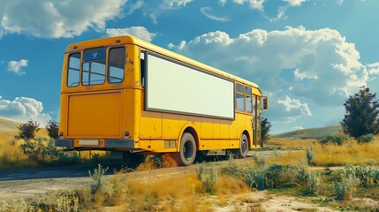 Saffron yellow bus on a sunny country road, blank billboard featured.