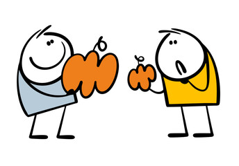 Two doodle gardeners demonstrate the harvest, show off pumpkins, and prepare for the autumn holiday. Vector illustration of the Halloween tradition. Isolated cartoon characters on white background.