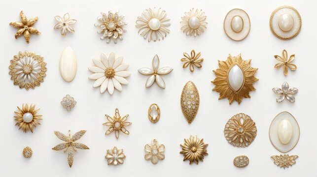 A collection of 24 vintage gold and pearl brooches on a white background. The brooches are in various shapes and sizes, such as flowers, leaves, and stars. The brooches are arranged in a symmetrical