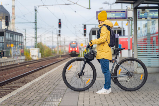 A man in winter clothes, waiting with his bike, the train. In the background the train that is about to arrive.