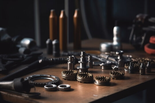 MTB mountain bike parts on table in bike repair shop or garage. Generative AI