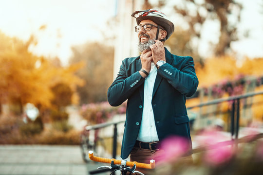 Rear view of businessman commuter on the way to work, riding bike over bridge, sustainable lifestyle concept.
