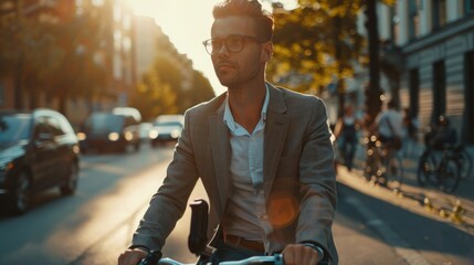 Successful hipster middle age japanese stylish businessman male man student costume going office work by bike riding bicycle morning city road. Healthy ecology lifestyle cycling transport bicyclist