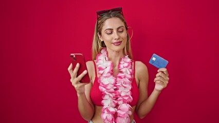Young blonde woman wearing bikini shopping with smartphone and credit card over isolated red background