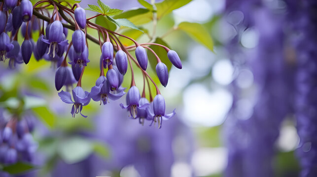 Wisteria frutescens, commonly known as American wisteria, is a woody, deciduous, perennial climbing vine, one of various wisterias family Fabaceae. Blue-purple, two-lipped flowers. Selective focus.