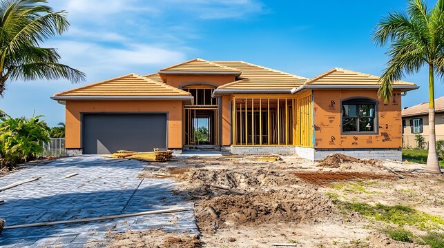 Street view of a bilevel singlefamily house under construction with garage entranceway at left in a suburban residential development on a sunny afternoon in southwest Florida : Generative AI