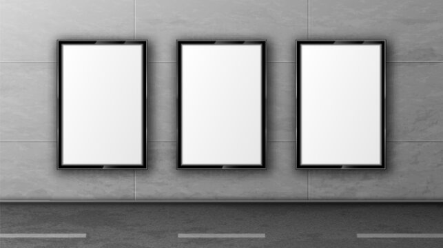 Blank street billboards on tiled wall. White posters in black frame for outdoor advertising. Vector realistic mockup of empty display boards on city road. Template of 3d promotion banners