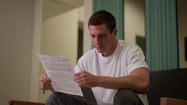 Focused male patient in casual clothes reading paper medical contract before signing and having medical procedure performed at hospital, while sitting on sofa in waiting room. Shooting in slow motion.