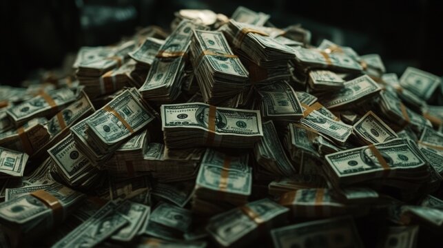 Many one hundred and fifty dollar bills on flat background surface close up. Flat lay top view