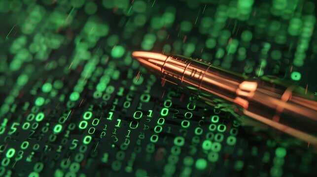 Close-up of a bullet on green digital binary code background symbolizing cybersecurity, hacking, technology, and digital threats.