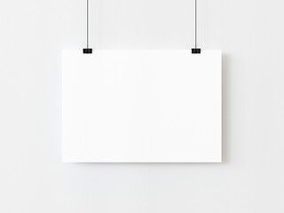 One blank horizontal rectangle poster template hanging on thread with paper clips on white background. 3D illustration