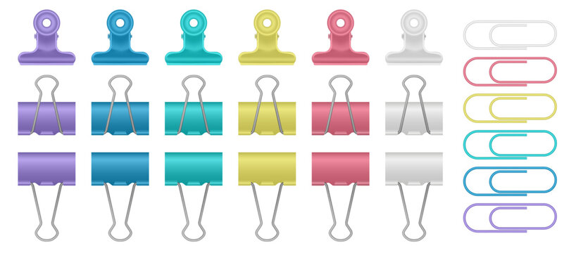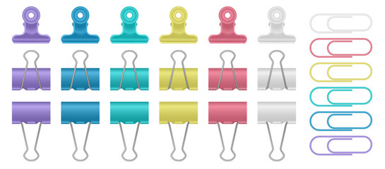 Set of multicolored binder clips, bulldog clips and paper clips. White, coral red, yellow, blue, teal and purple colors