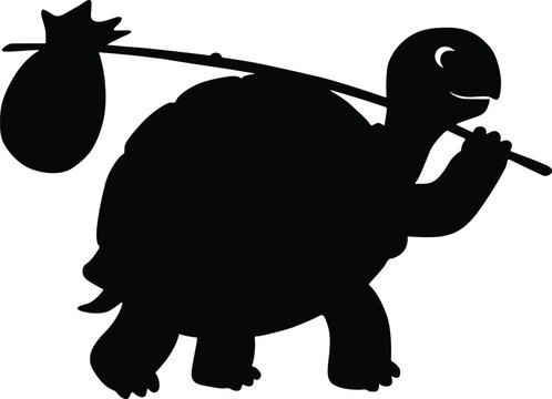 Whimsical silhouette of a happy tortoise carrying a bindle on a stick silhouette