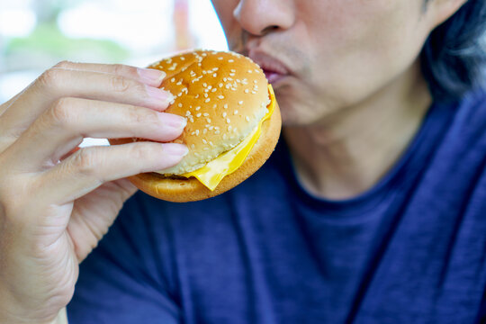 Hungry asian guy kiss burger In restaurant. Yellow Man enjoying junk food. Binger eating and unhealthy nutrition, Fast food overeating concept.