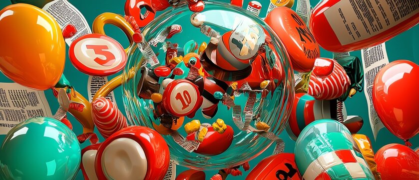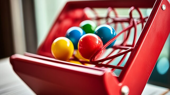 Colorful Red Raffle Game with Diverse Balls for Bingo and Lottery Excitement, Featuring a Vivid Array of Balls in Various Shades and Sizes, Perfect for Fun and Engaging Game Nights.