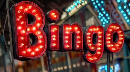 Brightly lit bingo sign inviting players to join in on the fun at a lively fairground. Generative AI
