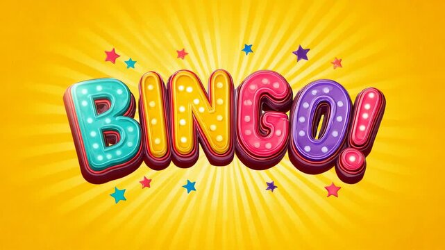 Colorful bingo text with bright lights and stars on yellow background entertainment game concept