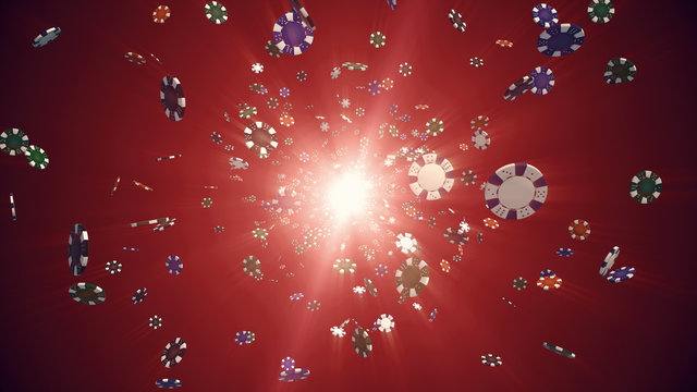 Flying casino chips in camera with rays of light on a colorful background 3d illustration