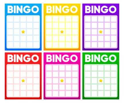 Many colorful bingo boards or playing cards for winning chips. Classic US or canadian five to five bingo cards on bright background
