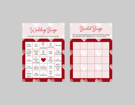 Bridal and wedding bingo game tickets for fun parties. 5 in row game. Romantic layouts with red heart pattern. Easy printable vector templates: 10*14 in
