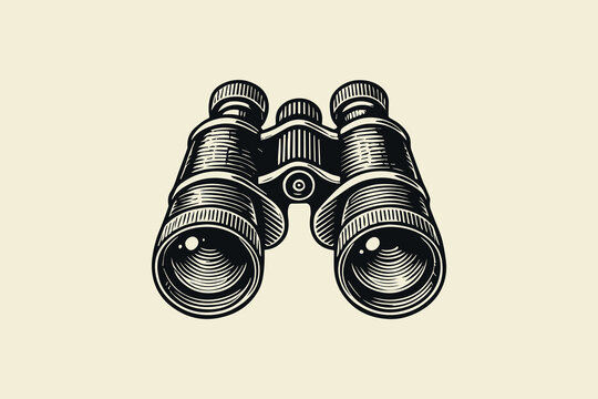 Vintage binoculars with detailed lenses in bold black-and-white engraving