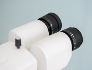 Slit lamp. Biomicroscope. Binoculars. Ophthalmic equipment.. Close up, selective focus. Health care concept. Space for text.