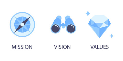 Mission, vision and values flat style design icons signs web concepts vector illustration set isolated on white background. Web page template concepts for business company strategy and teamwork plan.