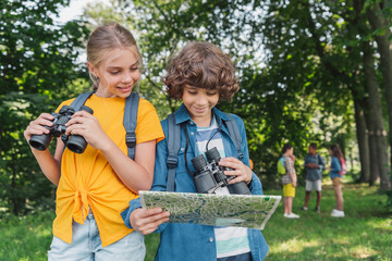 Little girl looking through a binoculars searching for an imagination or exploration in summer day in park. Happy child playing with binocular pretend safari game outdoor in the forest. Travel concept