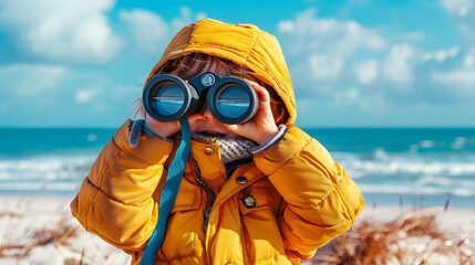 A photo of a child in explorer gear looking through binoculars on a sandy beach.