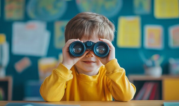 Excited child using binoculars to explore nature in a lush green environment during daylight