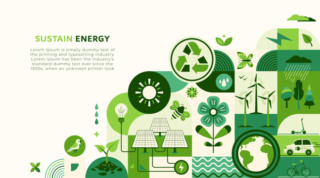 Green energy, sustain environment vector illustration. Ecology icons, recycle energy technology concept for eco friendly background. Save planet banner design in flat modern style, geometric shape
