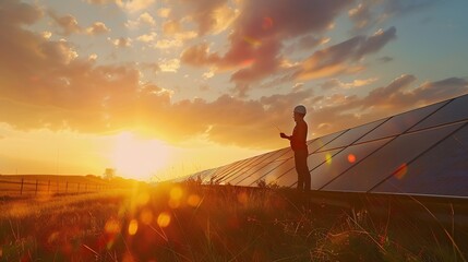 An young engineer is checking with tablet an operation of sun and cleanliness on field of photovoltaic solar panels on a sunset Conceptrenewable energy technologyelectricityservice gre : Generative AI