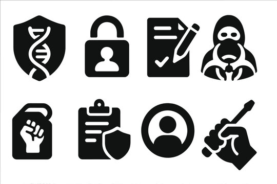 Ethical Hacking Icons. Solid style icons of ethical hacking symbols: DIY bioethics shield, personal data lock, informed consent