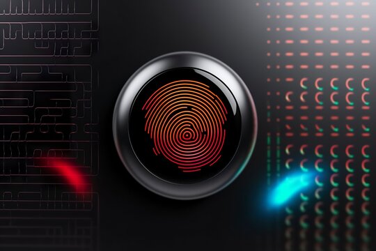Fingerprint Authentication Button. Biometric Security. Identification and cyber security concept. Glowing neon fingerprint on dark background.