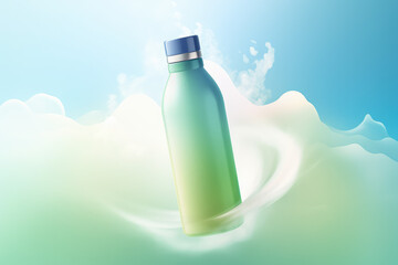 Creative mockup of a water, milk, juice or beverage bottle. Bottle against a beautiful sky and lush clouds. Green colors. Generative AI photo imitation.