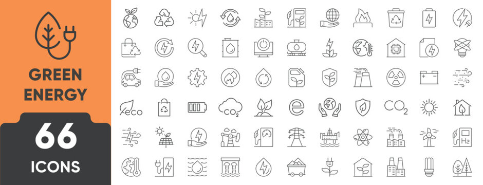 Green Energy Line Icon Set. Set of 66 outline icons including solar panel, wind turbine, eco light, recycling, battery, leaf, and renewable sources. Editable stroke. Linear vector illustration.
