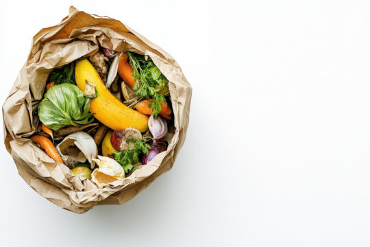 Paper bag full of organic food waste for composting on a white background with copy space