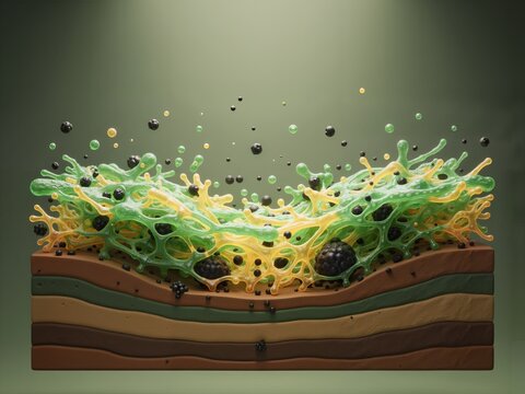 Abstract illustration of bioremediation and surface interaction, showing a bioactive polymer or microbial network capturing pollutants from contaminated soil layers.