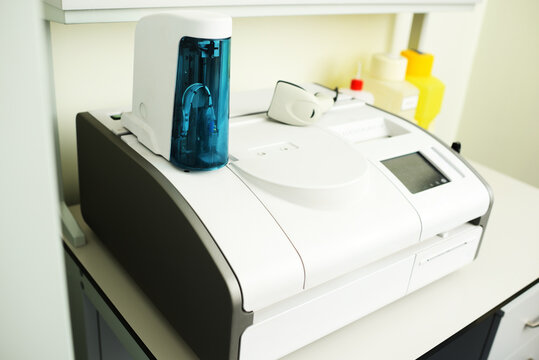 A laboratory biochemical analyzer analyzes blood serum samples. The automatic machine itself mixes the reagents and blood. The concept of laboratory equipment.