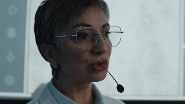 Experienced female doctor in white coat and glasses talking in mic in front of projection screen while giving presentation on healthcare conference