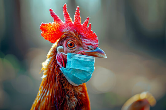 A close-up of a rooster wearing a medical mask, symbolizing the bird flu concept. Generative AI.