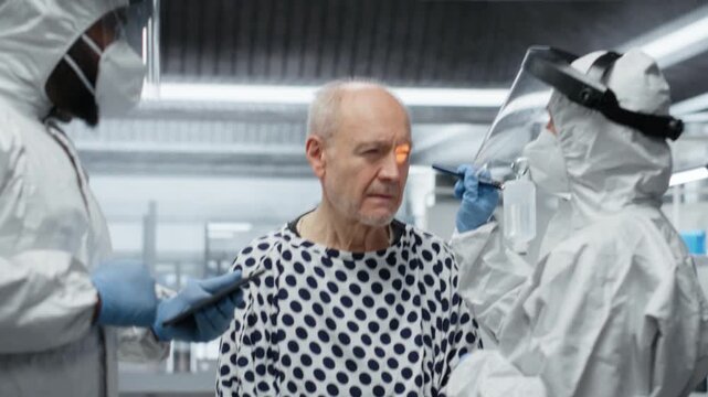 Researchers in biocontainment lab conduct experiments on viral pathogens, treating a patient under isolation to develop immunization and pharmaceutical cures for epidemic infections. Camera B.