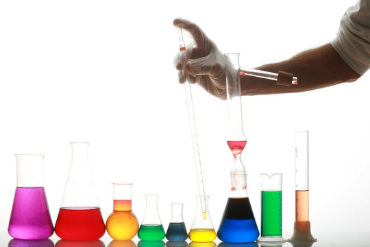 men's hands scientists are using aquatic release micropipette into the test tube. The process of research and development in laboratory science