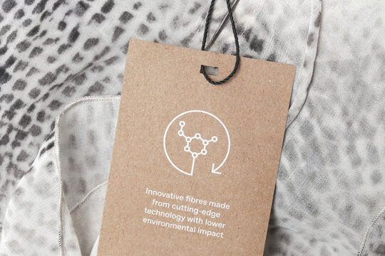 Label on clothes for Cutting-Edge Technologies in Fashion Industry, sustainable fabrics designed to reduce environmental impact. Recycled materials, organic textiles, and biodegradable fibers.