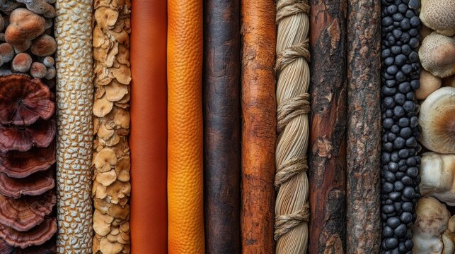 Mushroom leather reclaimed timber earthen pigments and woven plant fibers nature background