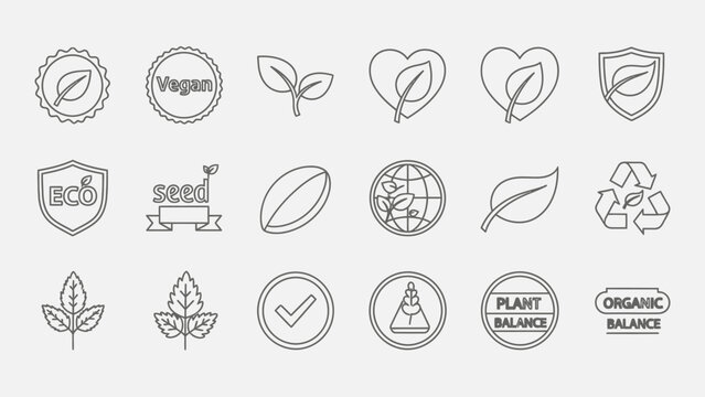 A collection of outline vector icons representing eco-friendly, vegan, organic, and sustainable products and concepts, including leaves, seeds, recycling, and environmental balance symbols.